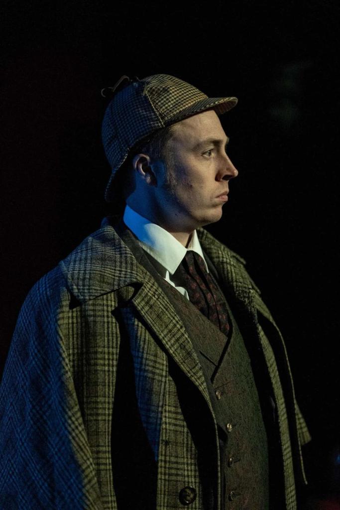 And so, to the Reichenbach Falls and the end for Holmes. From here on we gallop apace through three Adventures – The Empty House, The Sussex Vampire and The Creeping Man. The first a predictable tale of murder with a puzzle to the cause of death. It allows the remaining three actors in this troupe to begin their journey through at least 14 characters at my count. Lily Bennett (Mary Watson, Edith Presbury, Mrs Mason), Cassandra Wilson (Mrs Hudson, Alice Morphey), Edward Manning (Colonel Moran, Professor Presbury & more). Not forgetting Meredith who after his brief appearance as Moriarty brings us Inspector LeStrade, ‘Big’ Bob Ferguson and Dorak. All of these actors bring a clear definition between each of their roles through accent (never overplayed) and mannerism (the stillness of Moriarty particularly), the gentle humour of Mrs Hudson, the madness of Alice Morphey, the physical presence of Manning and the consistent serenity of Bennett. It would be remiss not to praise the clever use of lighting and the wonderful music that carries us apace through the many scene changes.